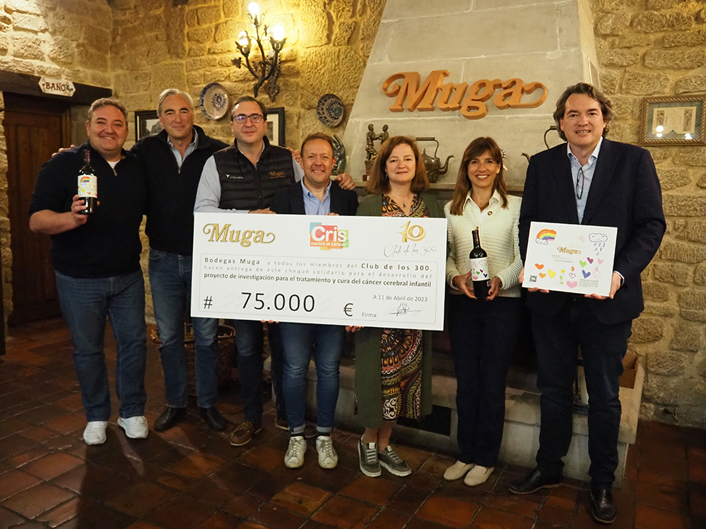 Bodegas Muga has presented a cheque for 75,000 euros as a donation from the “Wine for Research” project, through the initiative of the ‘300 Club’ and all the members of which it is made up and who have made it possible, in order to carry out a project to combat cerebral cancer in -Medulloblastoma-, the most common malignant brain tumour among children.
